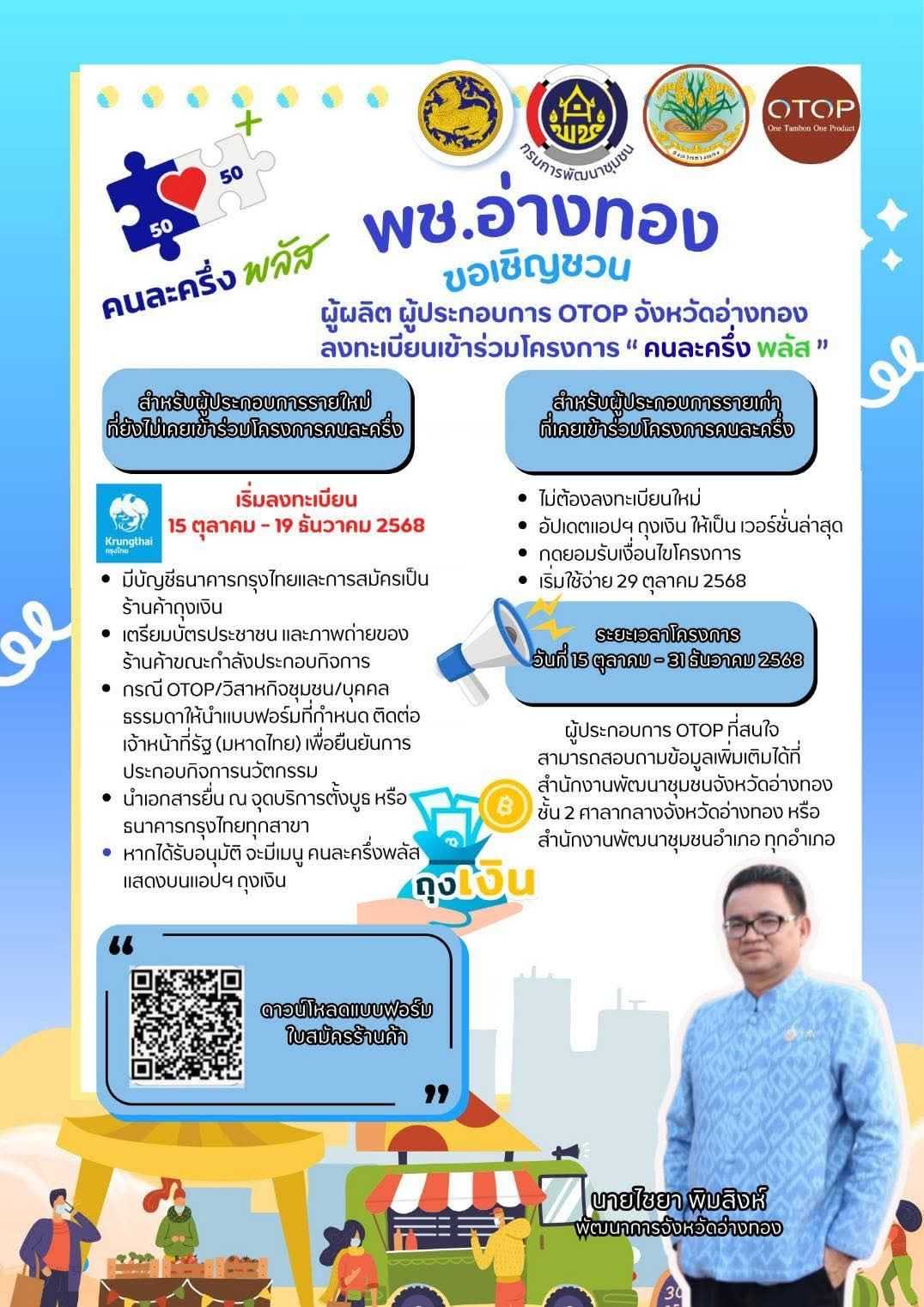 ขอเชิญชวน ผู้ผลิต ผู้ประกอบการ OTOP จังหวัดอ่างทอง ลงทะเบียนเข้าร่วมโครงการ “ คนละครึ่งพลัส”