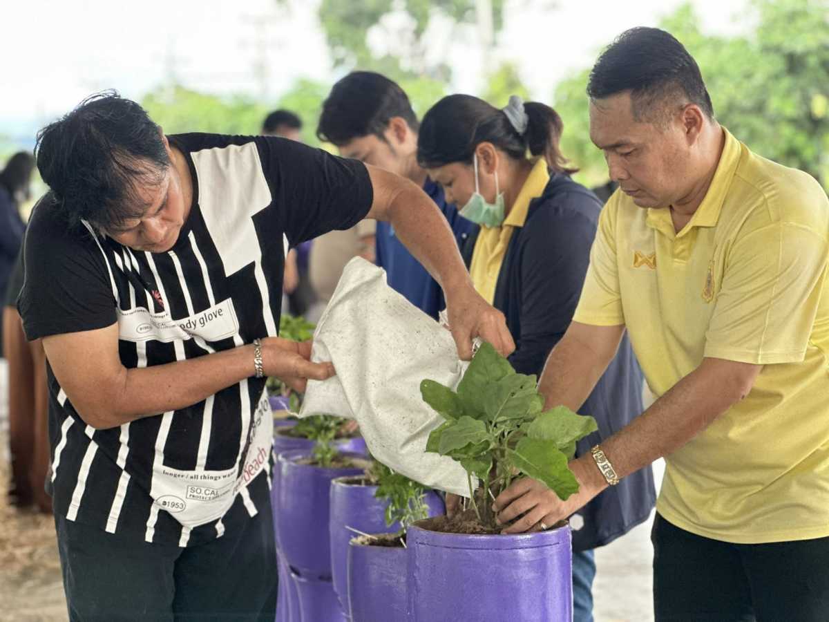 ปลูกพืชผักสวนครัวในหุ่นกลอง ณ ถนนเส้นหมู่บ้านทำกลองตำบลเอกราช